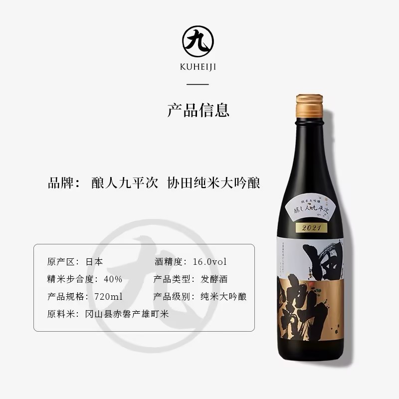 温馨提示:酿人九平次家的大吟酿追寻葡萄酒概念,前标年份为大米收成年份,灌装日期(生产日期)在背标哦