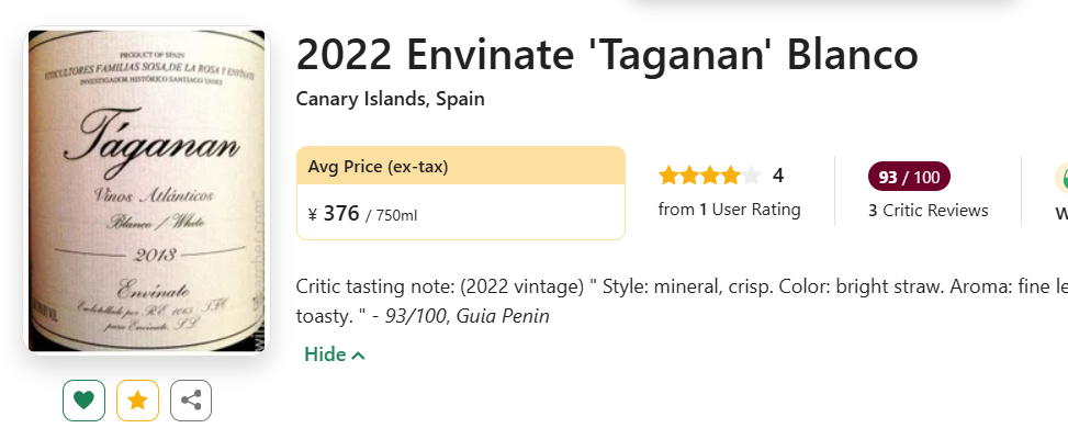 Envinate的代表系列Taganan的混酿白终于回归酒云!更有国均8折,给力!