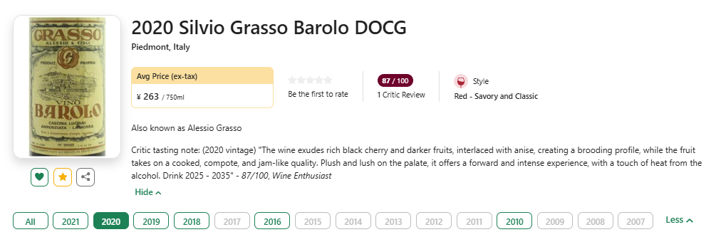 Silvio Grasso 的酿酒理念注重葡萄本身的纯净表达,酿出的巴罗洛酒体结构细腻,香气层次丰富,既有传统风土的深厚底蕴,又带有新派风格的明快果味和平衡感。