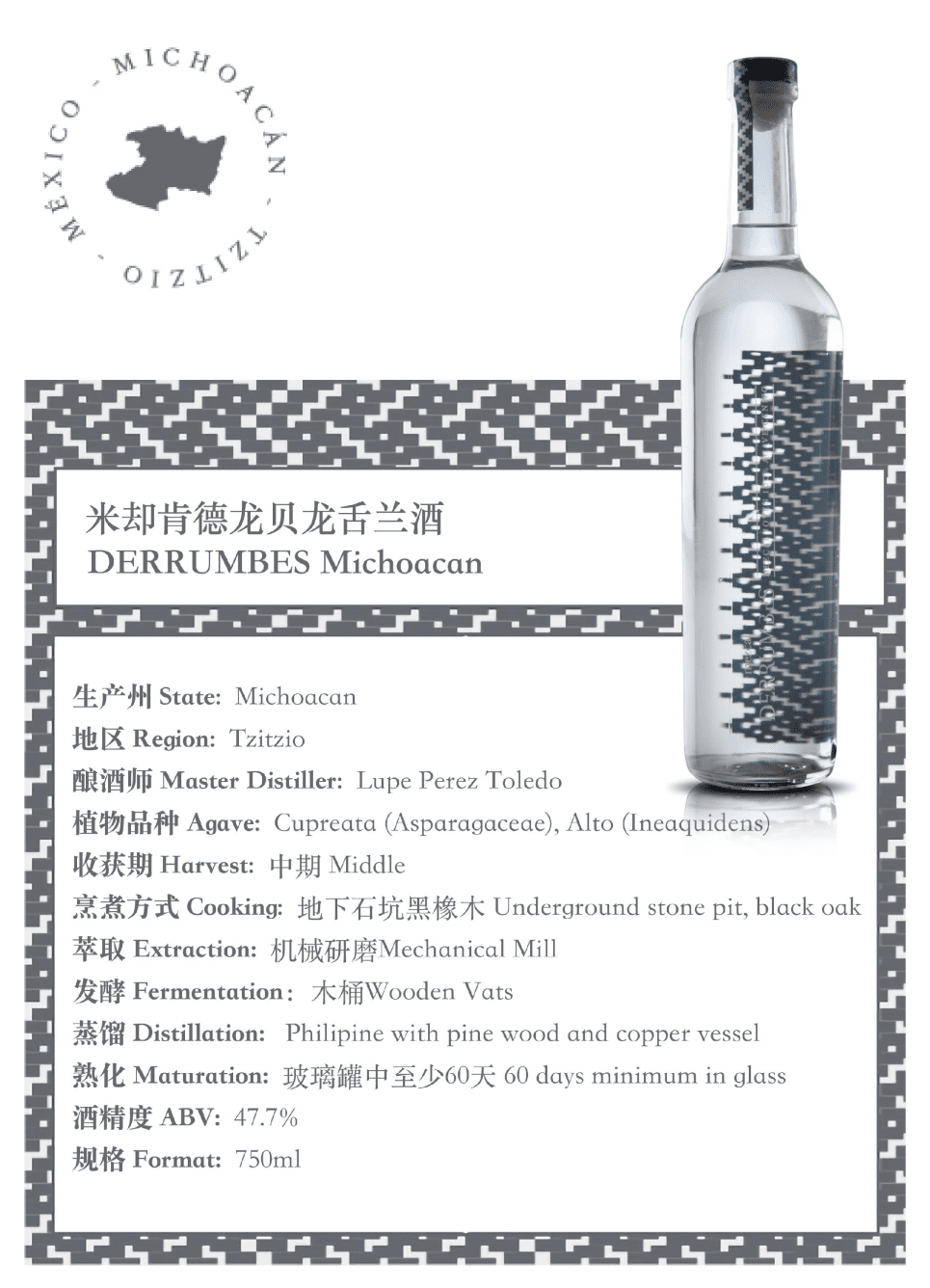 使用来自Michoacan州标志性的Chino(Cupreata)和Alto(Ineaquidens)龙舌兰,由Tzitzio村著名酿酒大师Guadalupe Perez以独特的祖传蒸馏技术酿造。