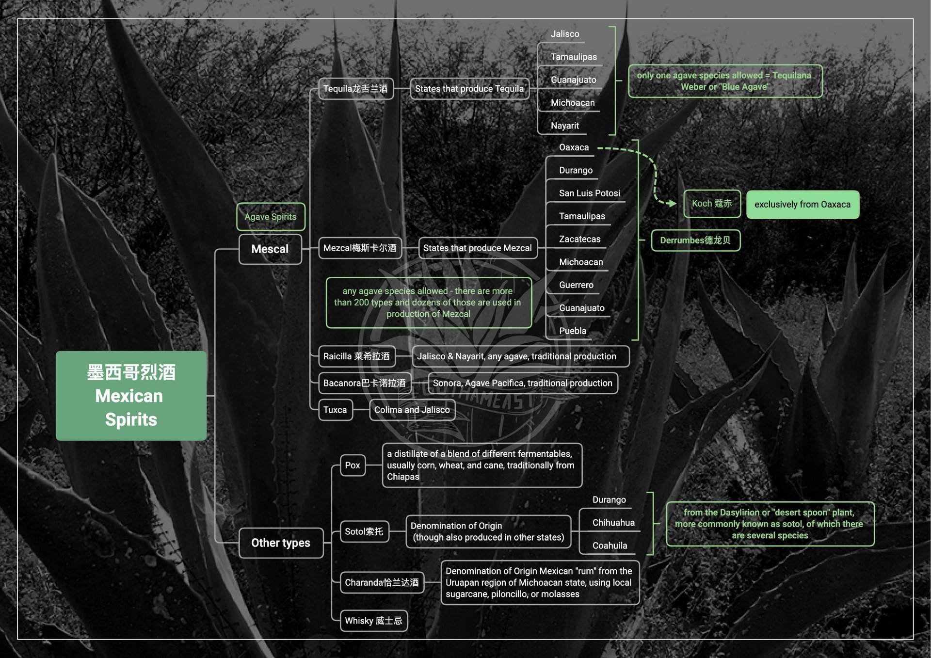 往下又分为特基拉Tequila(用蓝色韦伯龙舌兰酿造、更加工业化)、传统梅斯卡尔Mezcal、巴卡诺拉Bacanora、莱西拉Raicilla和一些其他种类。