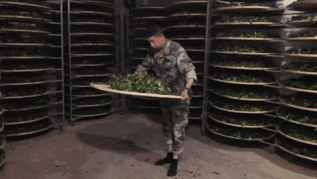 制茶师做青,摇一遍手大概是1小时,一般会做到9遍手,9个小时就这样过去了。通过多次摇动,叶片之间不断摩擦碰撞,使得叶缘细胞破损,均匀加深,经氧化发酵后产生绿叶红镶边的形态。