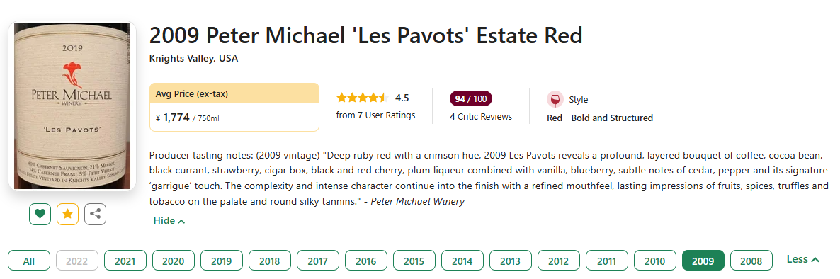 From RP:这款酒展现出独特的松露、巧克力、黑莓和黑加仑香气,口感丰满,具有上佳的浓郁度、纯净度和密度。这款非凡佳酿风格奔放,这点令人惊讶,因为大多数2009年采用波尔多品种酿制的北加州葡萄酒目前来说都有些严肃和封闭。