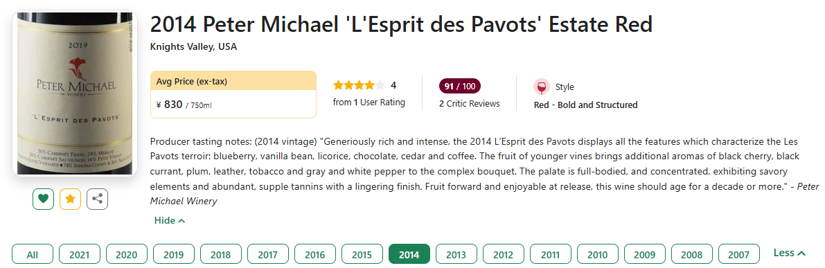这款经典波混的2014年份由50%赤霞珠、31%梅洛、17%品丽珠和2%小维多混酿而成,随后在精选的法国橡木桶中熟化了18个月。14年份在社会化酒评平台CellarTracker获得了93分,Vivino的各年份均分也是高达4.5分,可以说是备受众多消费者的青睐!