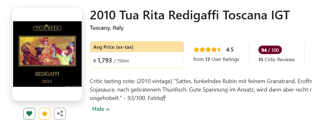 Tua Rita出品酒款是伦敦国际葡萄酒交易所(Lix-ex)中屈指可数的意酒之一。2000年出品的Redigaffi获得RP 100满分,使得Tua Rita成为FIRST个拿下帕克满分的意大利酒庄。