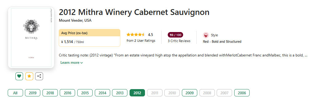 【清仓!国均5.3折!Vivino超高分口碑!纳帕大年赤霞珠!】Mithra Winery Cabernet Sauvignon Mount Veeder 2012