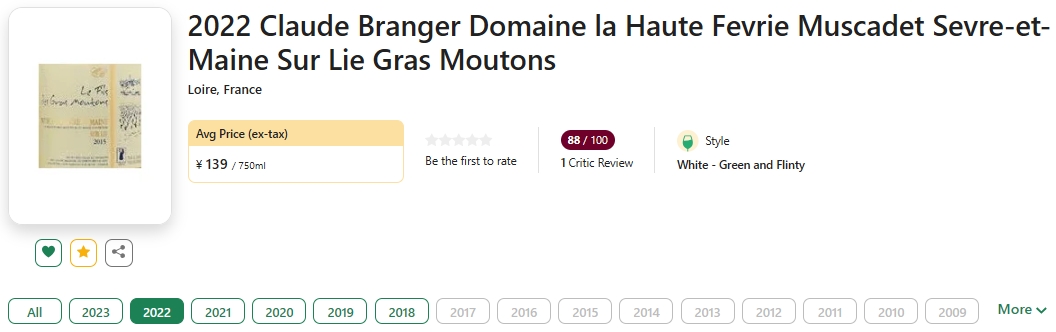 【国均7.9折!“勃艮第香瓜”专家,风土系列老藤单一园!】Claude Branger Domaine la Haute Fevrie Muscadet Sevre-et-Maine Sur Lie Gras Moutons 2022