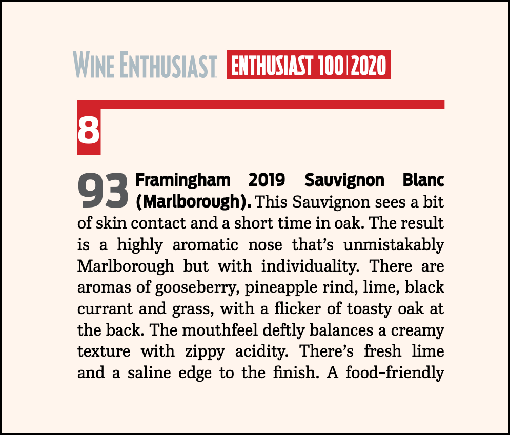 》Framingham Sauvignon Blanc 2019击败全球众多名家,斩获2020WE百大第八名,并且被评为Editor’s Choice,可见其深厚的实力与优秀风土