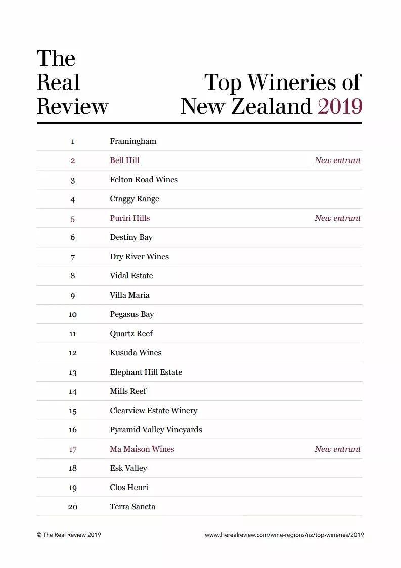 》2018、2019连续两年荣膺由权威葡萄酒评机构The Real Review发布的Top Wineries of New Zealand NO.1酒庄的至高荣誉