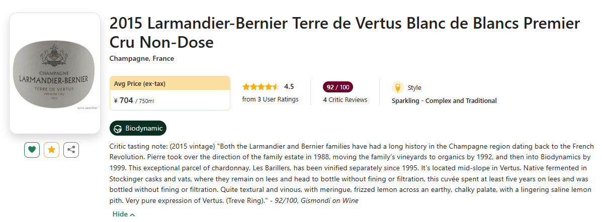 【持平均价!小农香槟三巨头之一 | 主力年份白中白】 Larmandier-Bernier Terre de Vertus Blanc de Blancs Premier Cru Non-Dose 2015 1.5L 现货