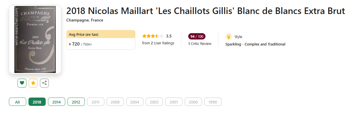 【国均8.7折!Bettane Desseauve两星推荐丨大年一级村老藤白中白】Nicolas Maillart 'Les Chaillots Gillis' Blanc de Blancs Extra Brut 2018 现货